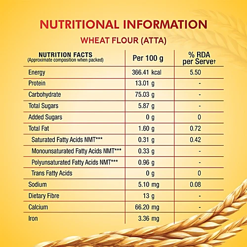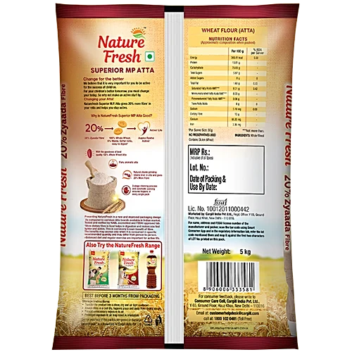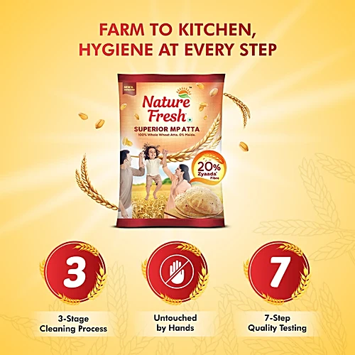 Nature Fresh Superior MP Atta is made from 100% whole wheat, offering a wholesome and nourishing choice for your daily meals. Carefully milled for superior softness, items easy to digest and ideal for fluffy, delicious rotis. Enjoy the perfect balance of taste, health, and quality in every bite.